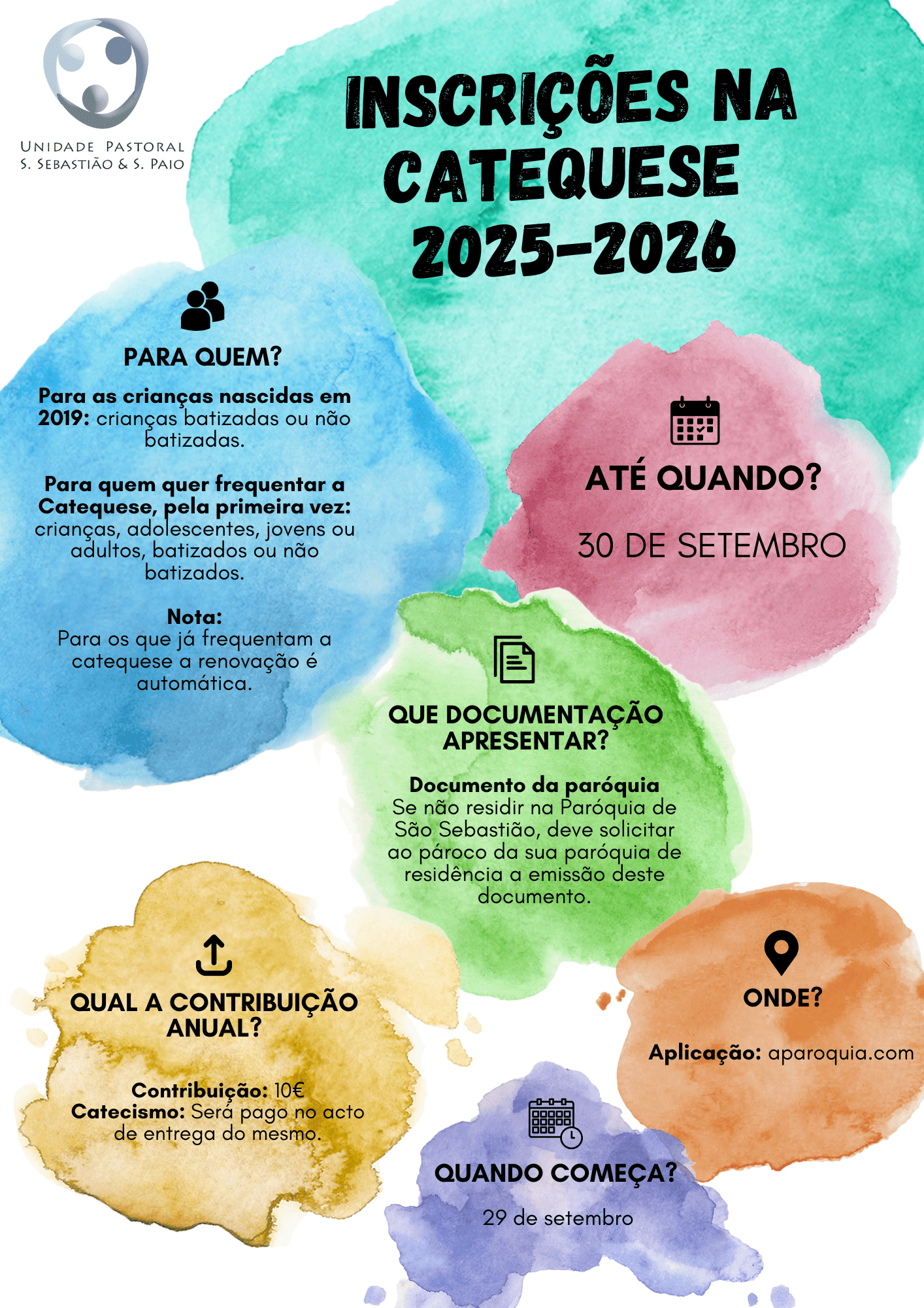 Quanto aos grupos de catequese e seu horário com tempo colocamos aqui para que haja uma melhor coordenação nos trabalhos do ano que está a começar: